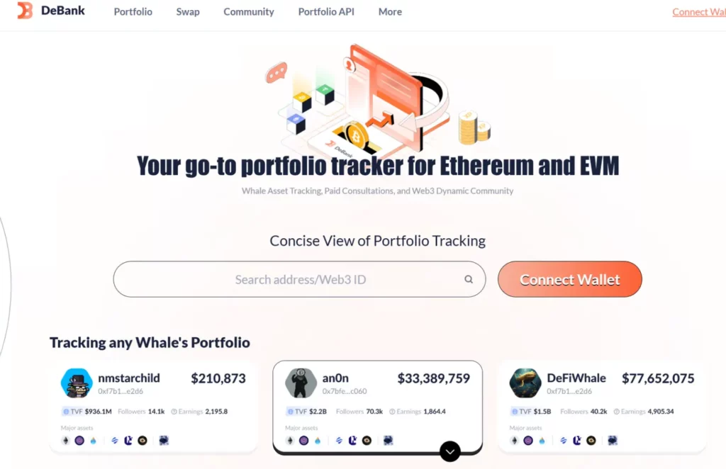 Debank est un portefeuille analytique très complet, souvent utilisé pour le suivi des positions DeFi avancées.