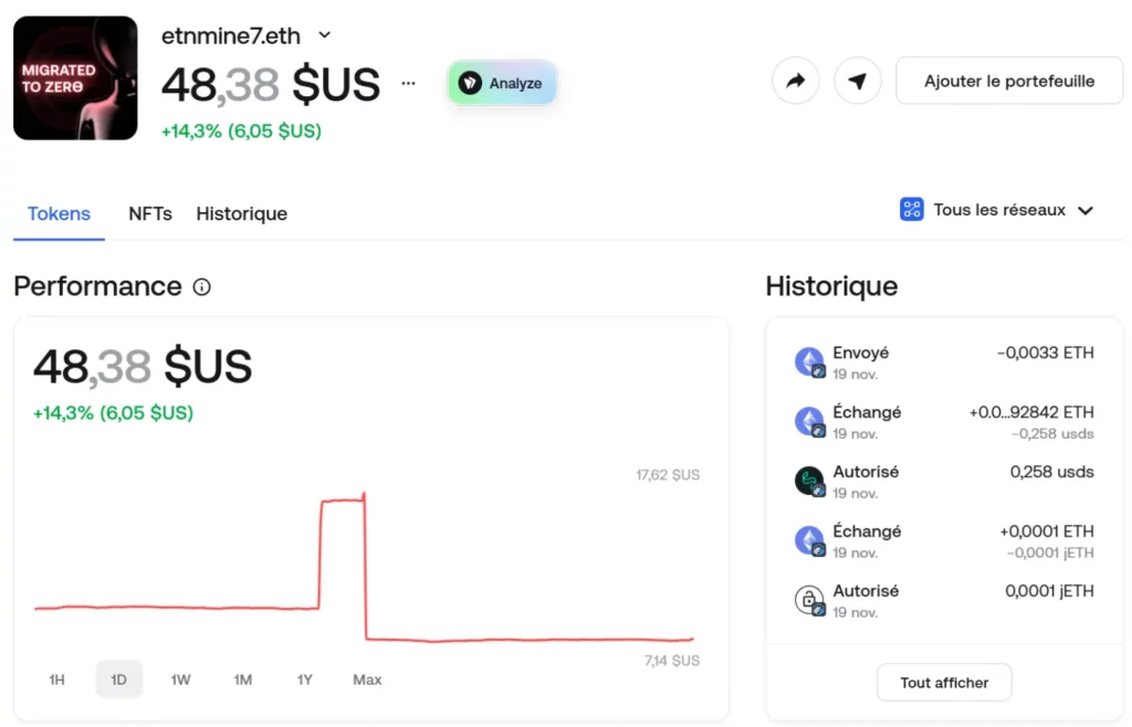 - Wallet connecté à Zerion